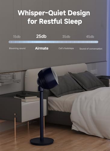 【Ultra Quiet DC Motor Performance】: No need to sacrifice performance for quietness, it reduces noise to 25 dB, making it the perfect quiet fan for bedtime or work, giving you peace of mind. Thanks to the combination of Airmate brushless DC motor and turbine blade technology, floor fan can quickly circulate air throughout the room. DC motor produces 30% more air volume and uses 40% less energy