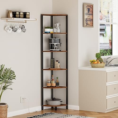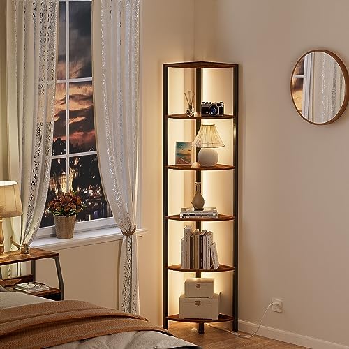 Furnulem 6 Tier Corner Shelf with LED Light, 67.5” Tall Standing Shelf Organizer, Narrow Bookshelf with Storage Rack for Wall Corner, Living Room, Bedroom, Metal Frame, Wood Display Shelf