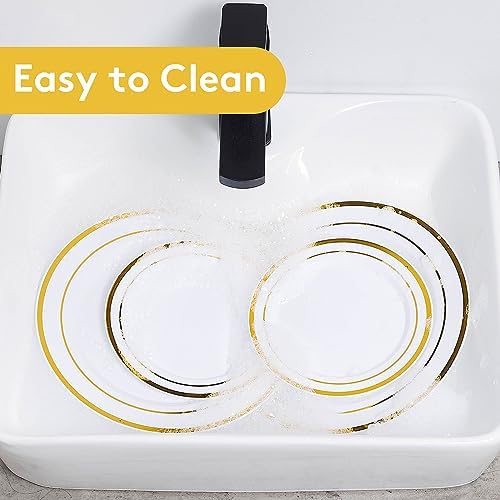 ELEGANT DESIGN – These disposable plates with a gold rim around the edge, these disposable dinner plates exude sophistication and elegance, reminiscent of luxurious china dinnerware. And instantly elevate any dinnerware setting, and will impress guests at any party or event.