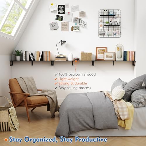 [Premium Material and Easy to Install] This large floating book shelves are made of solid wood with advanced manufacturing processes. The package included all mounting hardware and clear installation manual. You will easy to assemble those bedroom wall shelves within minutes. The durable floating shelves can hold up to 40 lbs.