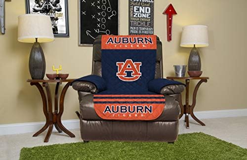 Auburn Tigers logo on a blue and orange quilted microfiber furniture protector with elastic straps.