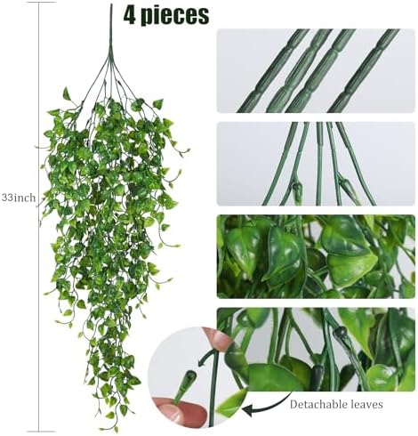 Faux Vine Plant Package Includes: 4 packs of green artificial hanging plants, and the total length of the artificially hanging plants is approx. 33” long,7.8” wide, has 5 flexible stems, bushy leaves and a few small branches with many leaves. About 160+ fake green leaves per pack, a total of 585 leaves. Each green leaf has many stems that make it look very vivid and three-dimensional