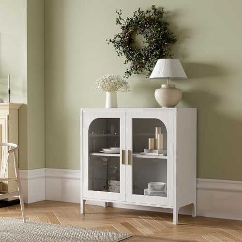 This modern sideboard storage cabinet is designed to bring both style and organization to your home. With a clean white finish and refined arched door details, it adds a sophisticated yet approachable look to any space. The spacious tabletop offers a perfect platform for decorative items, coffee machines, or serving trays, while the enclosed cabinet keeps everyday items organized and out of sight. The adjustable interior shelves allow you to customize storage for items of different heights, with generous interior clearances of 12.8 inches and 17.6 inches to accommodate taller belongings. Built from durable engineered wood and supported by raised legs, this cabinet provides dependable stability while allowing easy floor cleaning underneath. Whether used as a buffet cabinet in the dining room, a console cabinet in the entryway, or a storage solution in the living room, this versatile piece adapts effortlessly to your lifestyle.