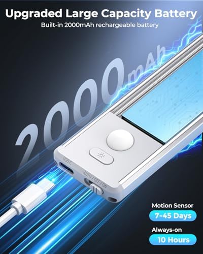 【USB-C Rechargeable Under Counter Lights for Kitchen】: These led lights have a built-in 2000mAh rechargeable battery providing long-lasting light and can be easily recharged with the included USB-C cables instead of constantly replacing disposable batteries. On a single charge, it can last about 30-60 days with moderate use on Auto mode, or last 10 hours on Always-on Mode at Max brightness