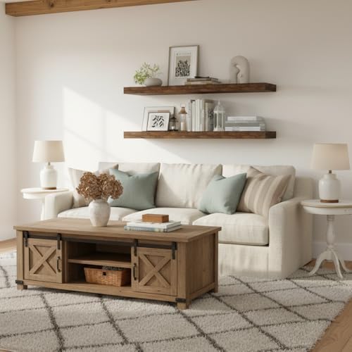 Sturdy Support – Each wall shelf measures 36″W x 12″D x 2″H. Enhanced Military Grade Hardware brackets hold up to 65 lbs, 2.5° upward angle design ensures long-term stability, preventing tilting or sagging